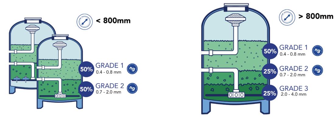 對(duì)于較大直徑的過(guò)濾器(> Ø 800mm),使用 50% 的 AFM®ng 1 級(jí)、25% 的 AFM ® ng 2 級(jí)和 25% 的 AFM® 3 級(jí)。需要 AFM® 3 級(jí)來(lái)覆蓋大過(guò)濾器的側(cè)面,并確保 充足的水流量。