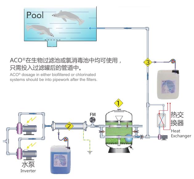 在動(dòng)物系統(tǒng)中,ACO®最好是在AFM過(guò)濾后,通過(guò)計(jì)量泵持續(xù)添加。投加量根據(jù)系統(tǒng)的負(fù)荷量確定,范圍在0.5 - 1.0ml每立方米過(guò)濾量之間。